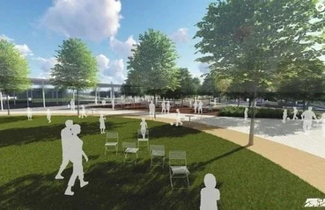 The planned southern Dallas deck park, over Interstate 35E near the Dallas Zoo, would include an activity lawn and pavilion as shown in this rendering. (City of Dallas)