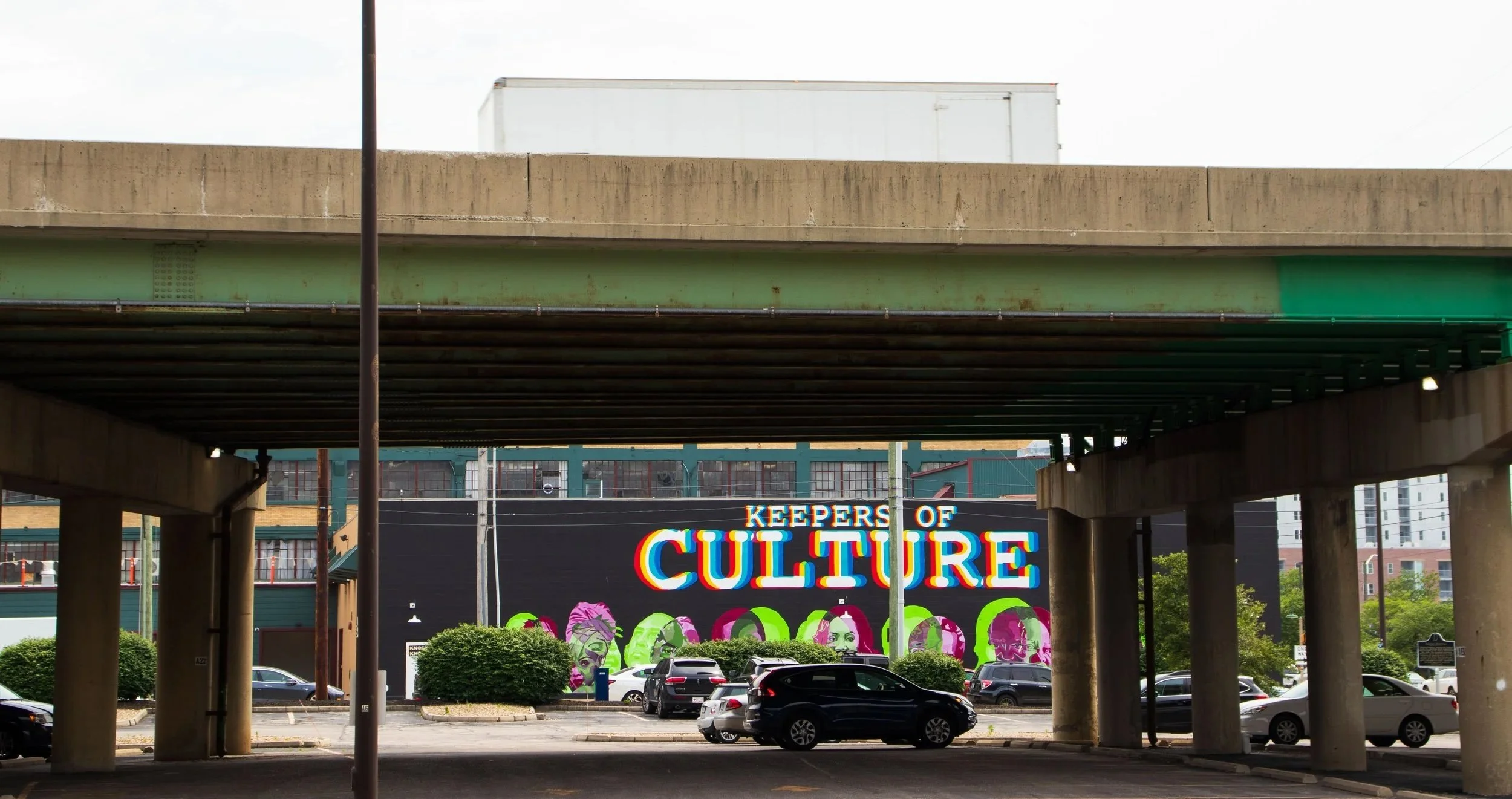 A semi drives above the “Keepers of Culture” mural on the Stutz Building near the Northwest Gate. The 3D mural depicts eight Black Hoosier artists and entrepreneurs. Splashes of color and public art, like this mural, are sprinkled along the edges throughout the Inner Loop.