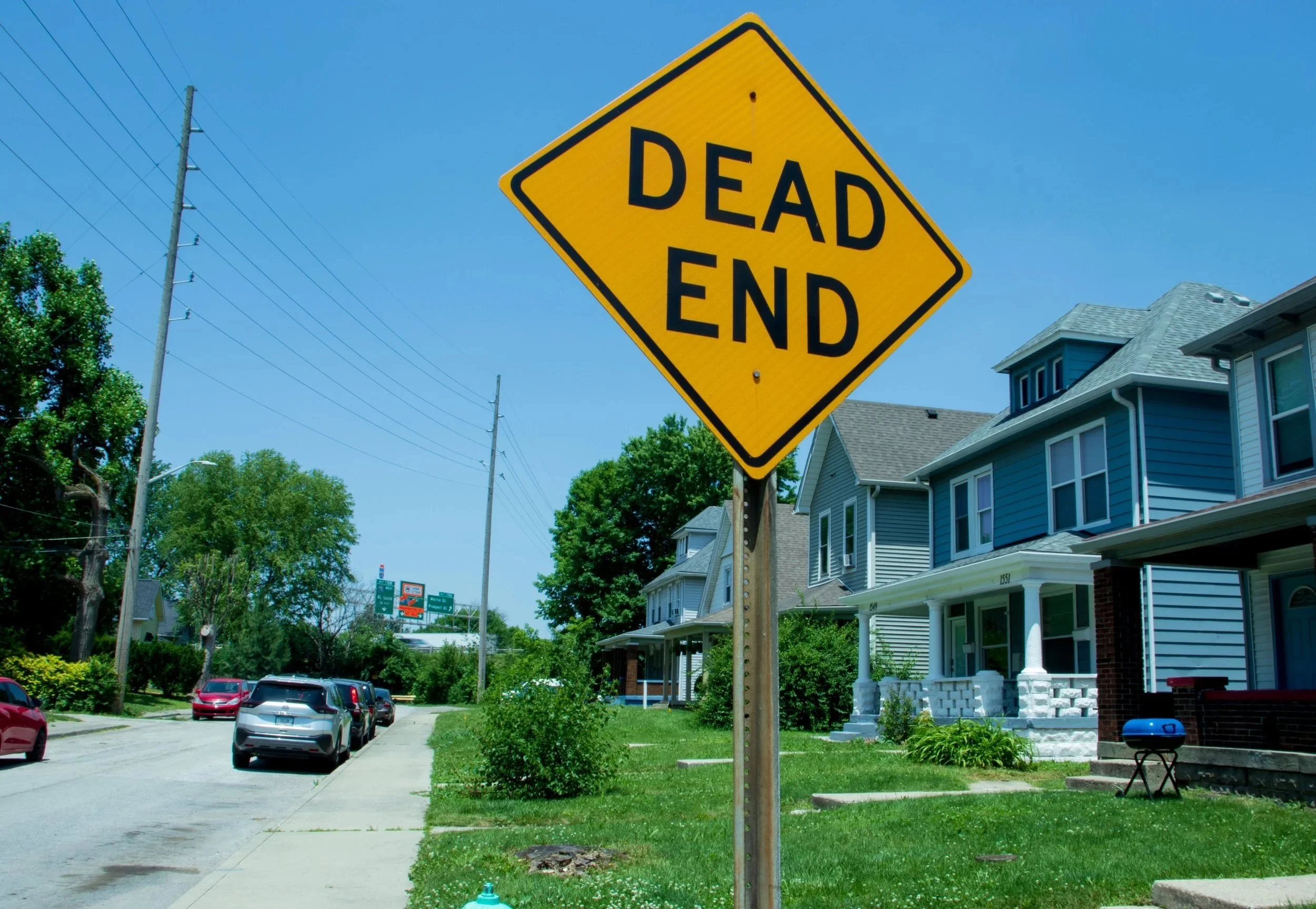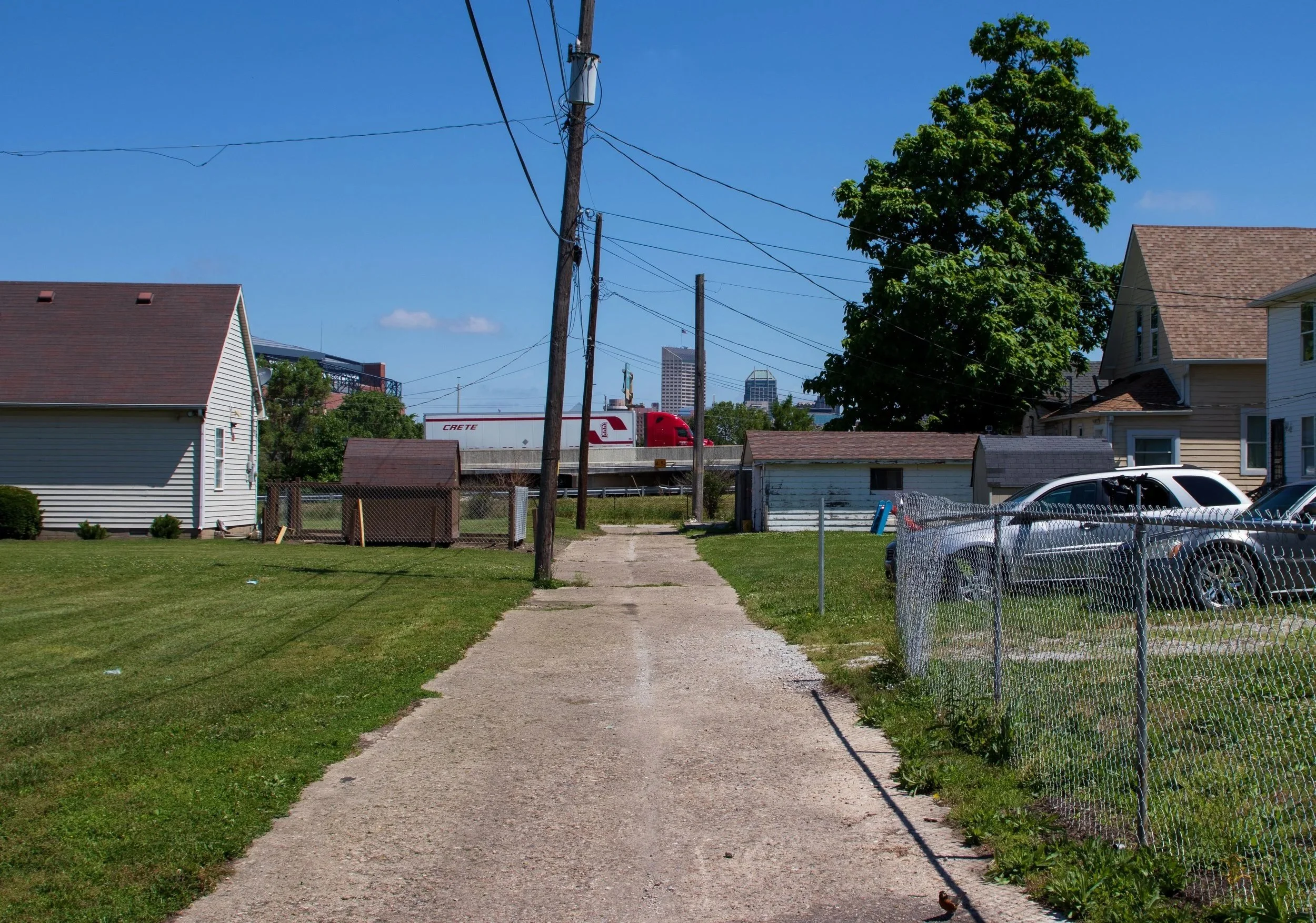 A street in Bates-Hendricks dead-ends into the I-65. Residential streets that cross the highway attracted higher speed traffic.