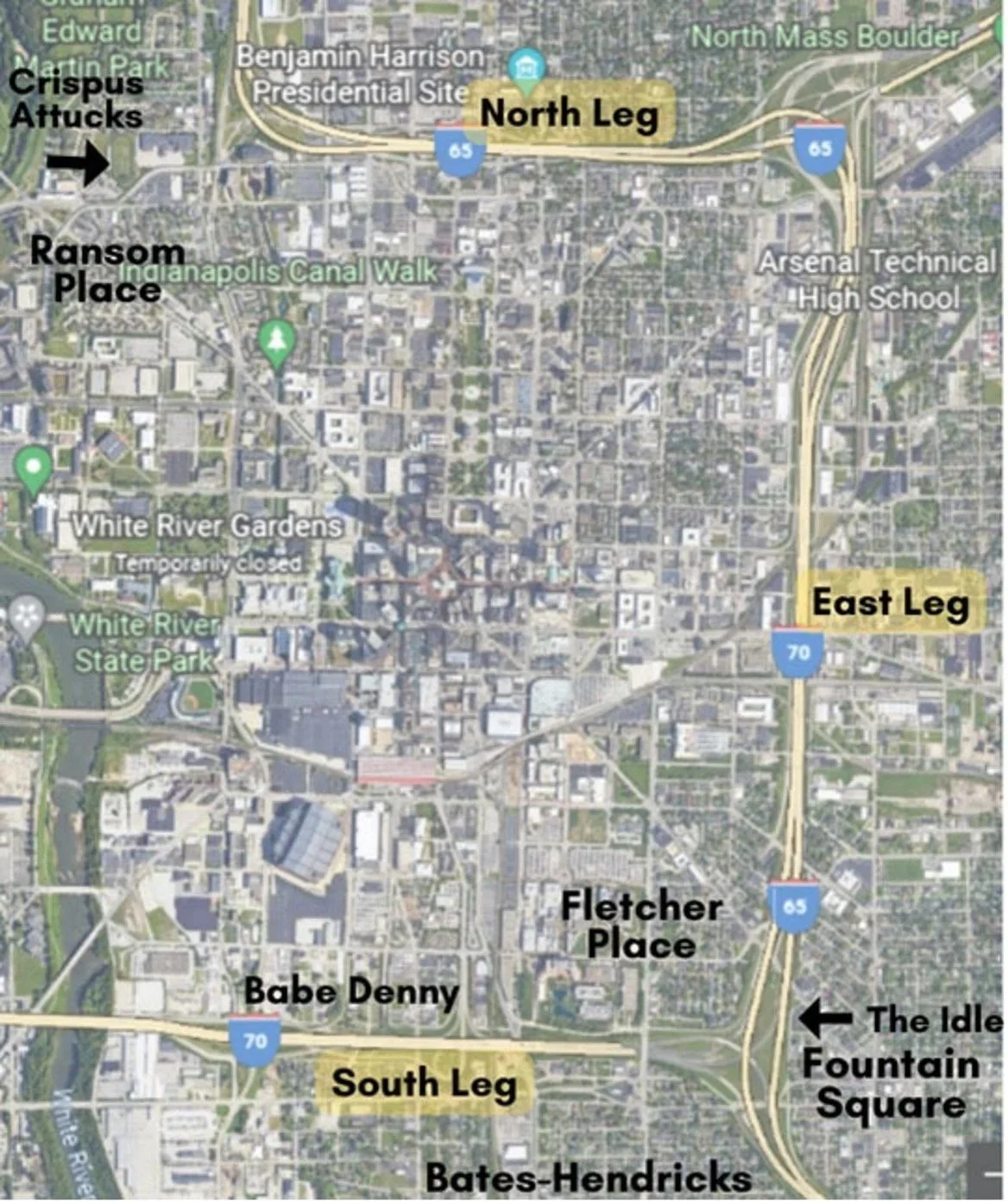 A map marking the areas I visited along the Inner Loop that encircles Downtown Indianapolis. The names are references to the neighborhoods around the three major sections of the highway scheduled for reconstruction: the North Leg, South Leg, and South Interchange.
