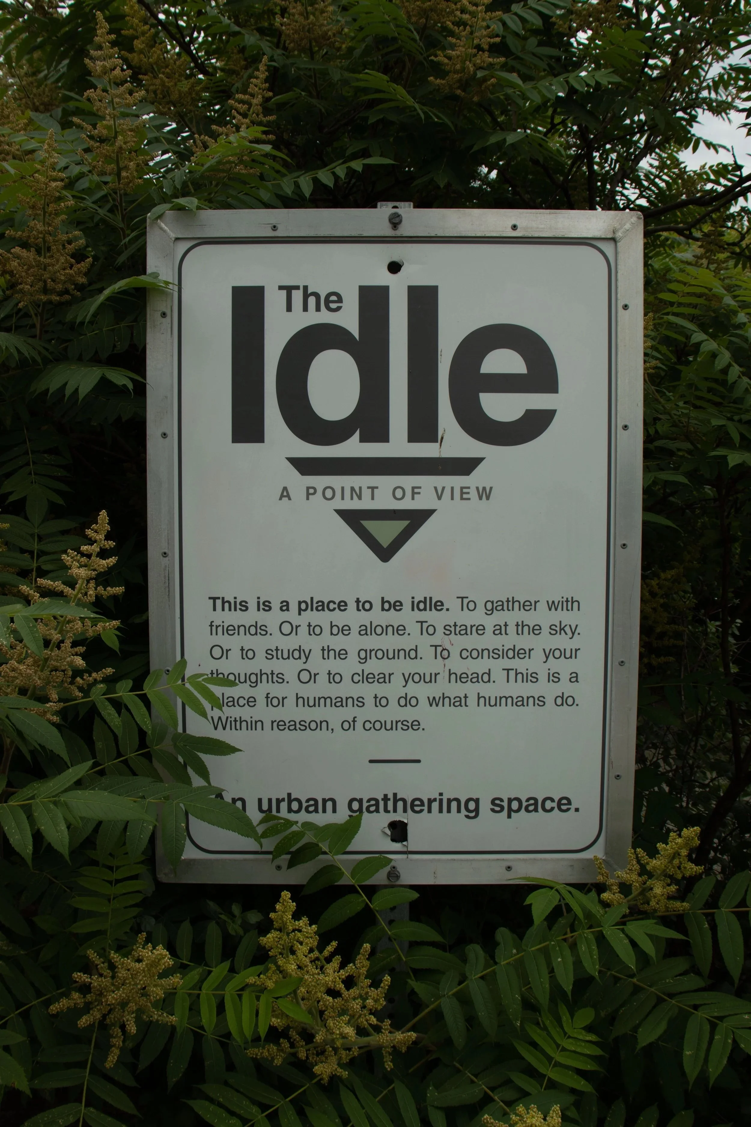 The sign tucked into foliage at the entrance of The Idle, introducing it as an urban gathering space.