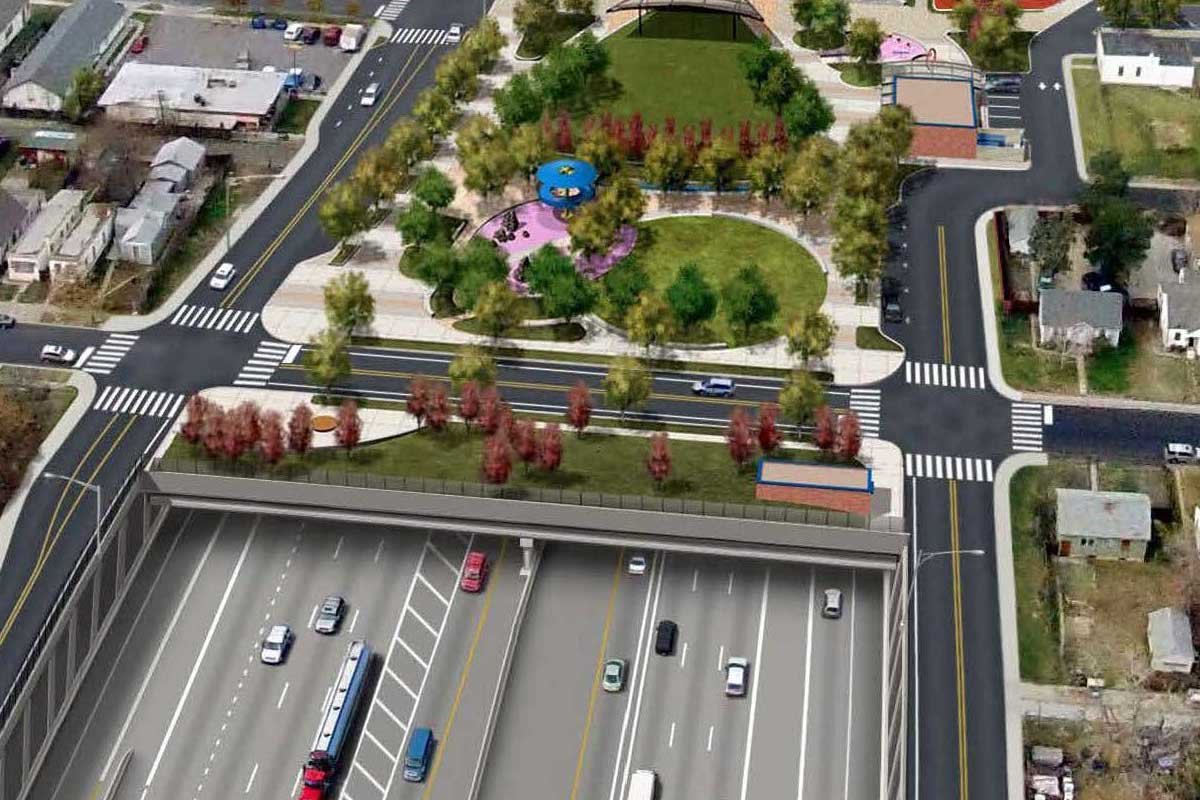 The recessed design will help lower interstate noise and expand green spaces to improve air quality. It will also provide additional room for sidewalks and bike paths.