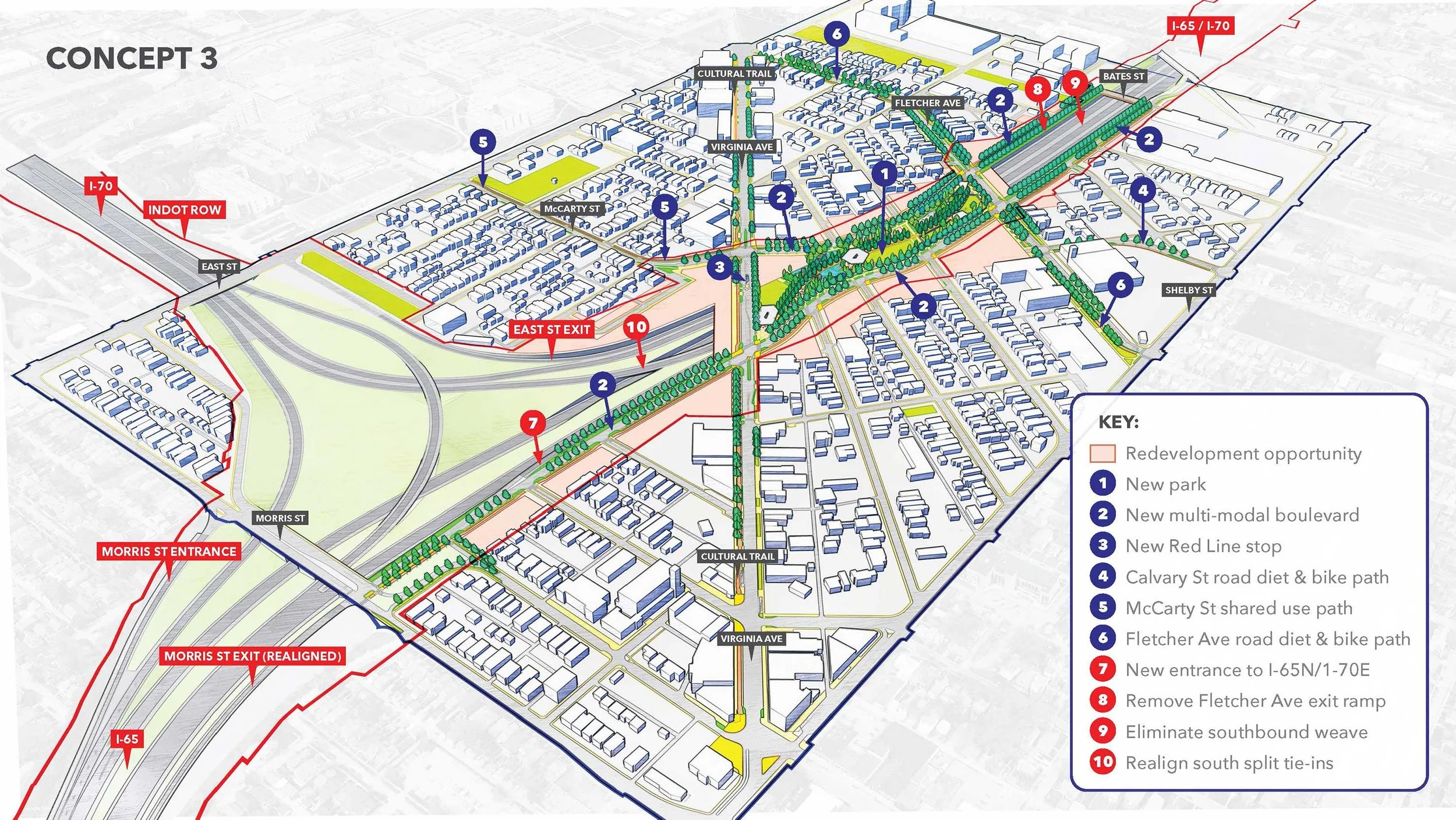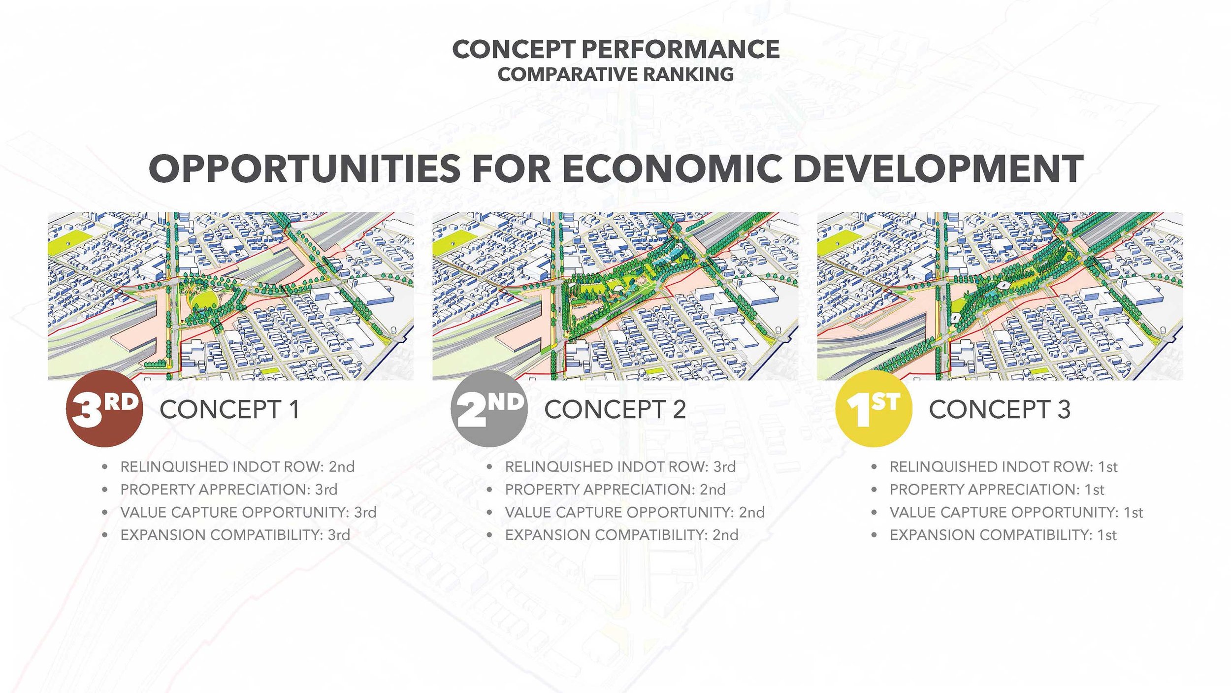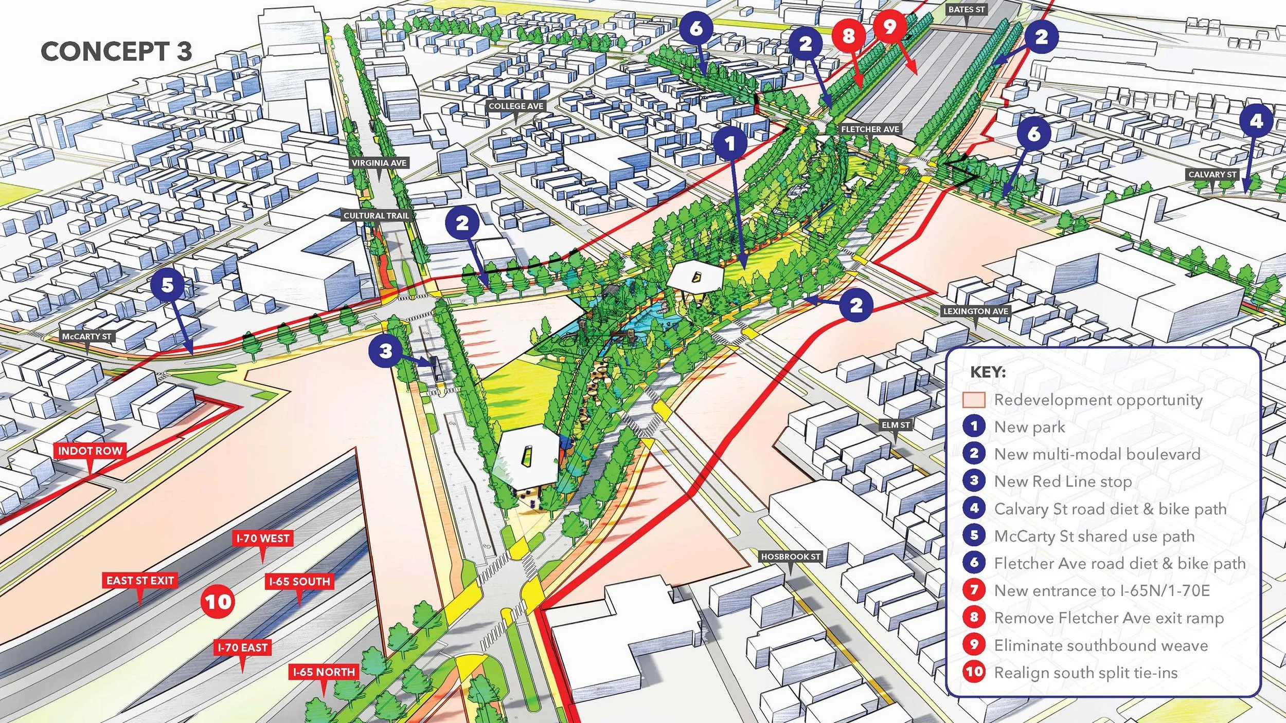 Concept 3 is the most complex and most transformational. It involves modifying the current interstate configuration and will require INDOT and the City to deal with traffic challenges and potential lane reconfigurations outside the Study Area. The Washington Street interchange is one example. As reflected in the next section, Analysis of Key Objectives for Each Concept, Concept 3 offers the greatest return on investment, including achieving the economic returns necessary to fund the Plan.