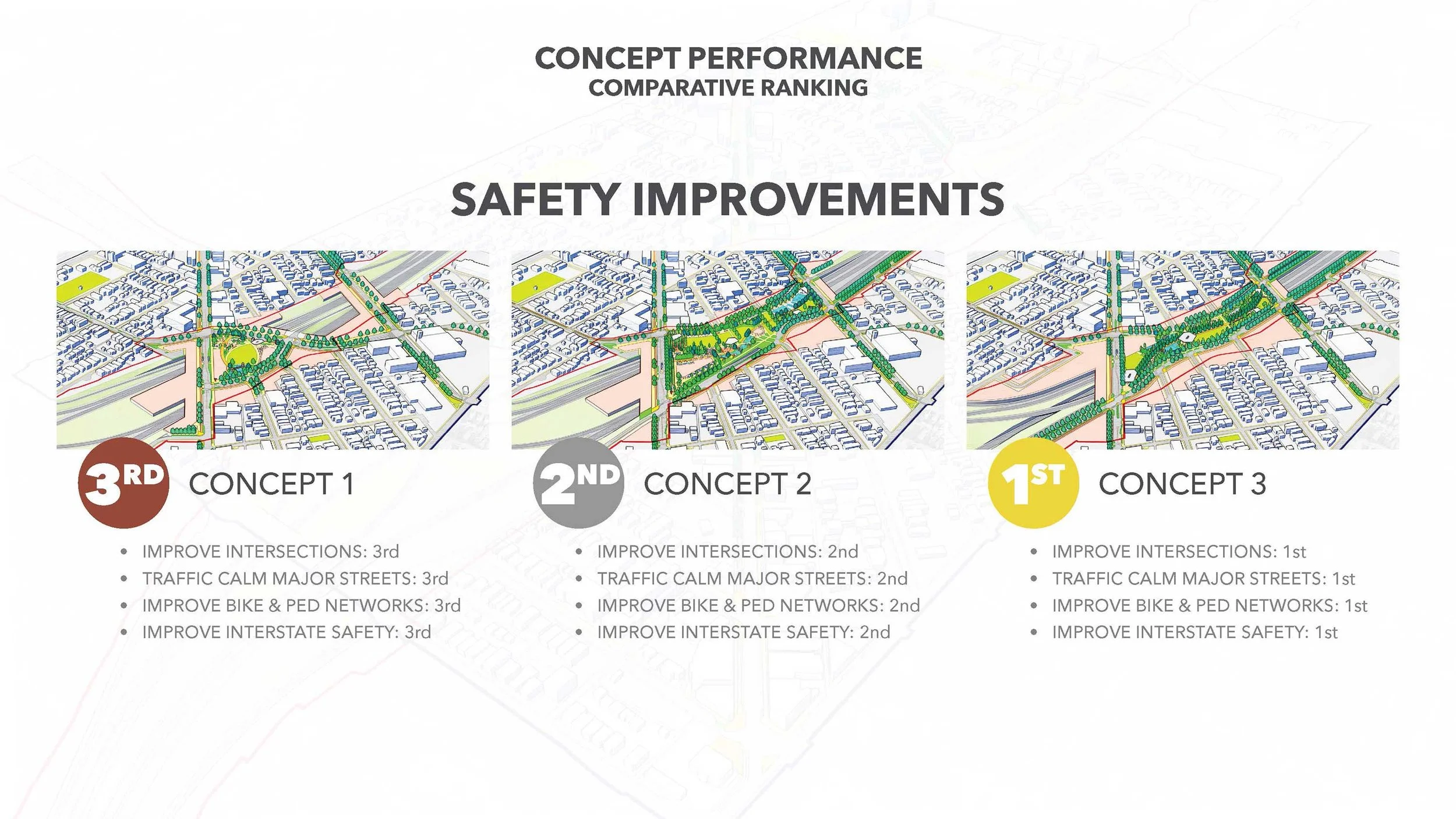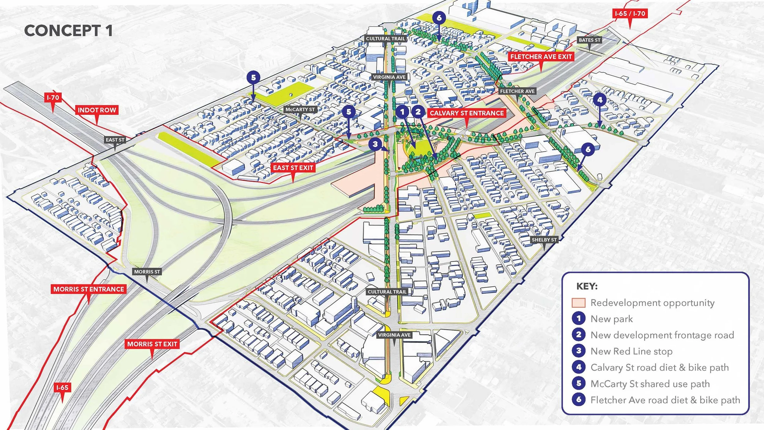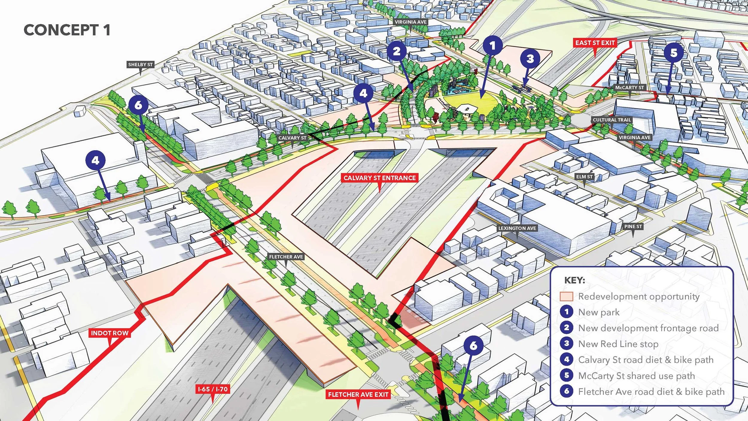Concept 3 is the most complex and most transformational. It involves modifying the current interstate configuration and will require INDOT and the City to deal with traffic challenges and potential lane reconfigurations outside the Study Area. The Washington Street interchange is one example. As reflected in the next section, Analysis of Key Objectives for Each Concept, Concept 3 offers the greatest return on investment, including achieving the economic returns necessary to fund the Plan.