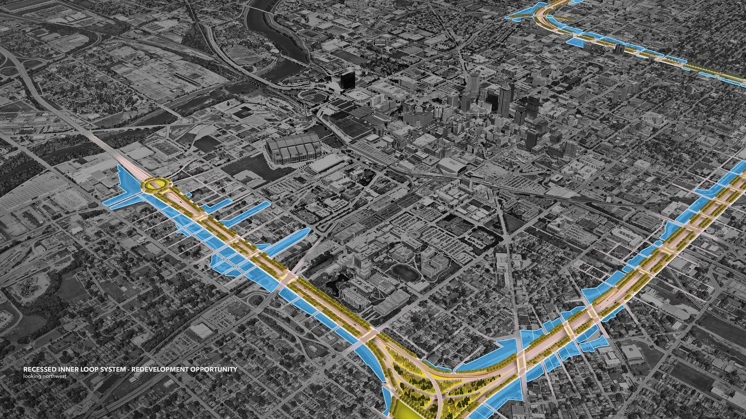 This image shows a recessed Inner Loop system with a compressed footprint freeing up State-owned interstate right-of-way (highlighted in blue) for redevelopment.