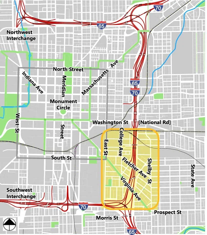Indianapolis has an incredible opportunity to reconnect its neighborhoods in a way that dramatically improves prospects for long-term economic, social, and environmental viability. Rethink Coalition, a 501(c)(3) charitable organization, in partnership with the City of Indianapolis, and The Greater Indianapolis Chamber of Commerce and Foundation (Indy Chamber), and in cooperation with the Indiana Department of Transportation (INDOT) have completed a Planning Study of the redesign of the I-65/I-70 Southeast Gateway of the Interstate Inner Loop in downtown Indianapolis to reconnect neighborhoods divided by the interstate through a comprehensive redevelopment plan (the SE Gateway Plan or Plan).